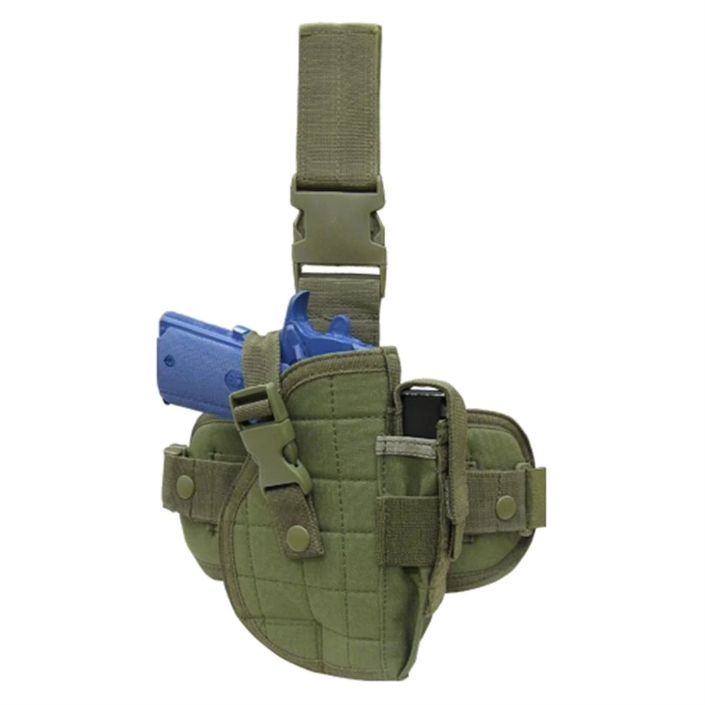 The Universal Leg Holster is designed primarily for easy attachment and detachment, as well as ensured comfort during periods of extended use. It’s fully adjustable with a hook-and-loop system in order to suit a wide range of handguns. The padded holster protects the weapon effectively, and the adjustable leg strap comes with a non-slip rubber lining to securely keep the holster in place. The attachment buckle gives the user the opportunity for quick release when needed. The magazine pouch comes with an adjustable option, making a convenient pocket to store an extra magazine. On the back there are attachment straps that can be attached onto the belt.